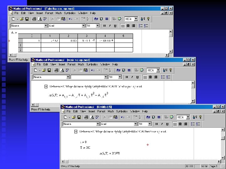 Data in tables n n Tables are analogous to matrices The numbers of columns and rows can be dynamically changed (in contrast to matrix) To enter table: u Menu: Insert/Data/Table (MC v. 15) u In placeholder type variable name which will be assigned to table u In cells type the values u Each rows and columns must contains the same number of data. If data are missing the value ‘ 0’ will be assigned Access to data in table is identical to matrix.