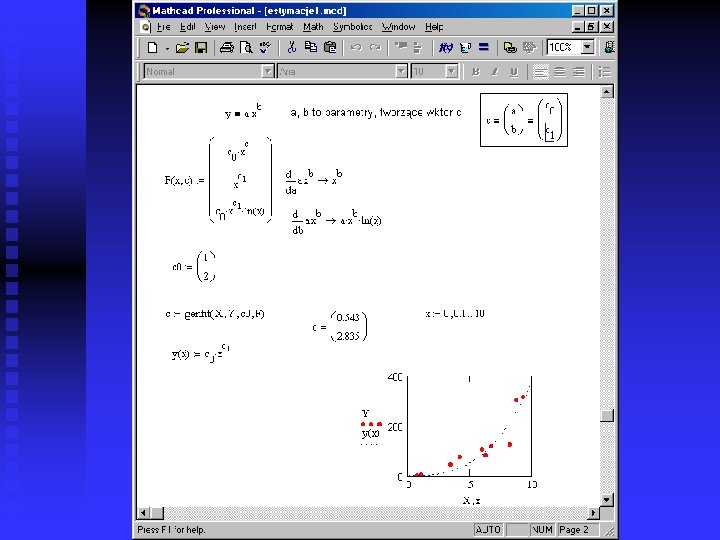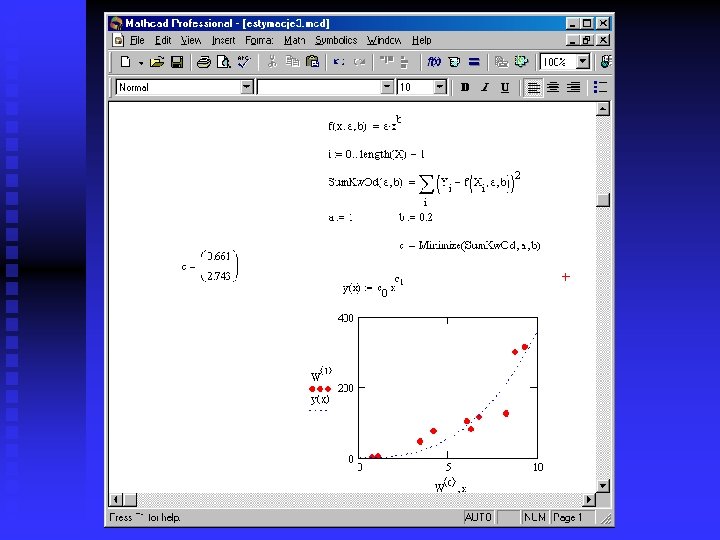 Square-mean approximation in Math. CAD n Function: minimize(function, p 1, p 2, . . . ) can be used to determine parameters of approximating function minimizing the sum of square deviations between values given in the table and calculated from the function. u function calculates the sum of square deviations as a function of parameters. u p 1, p 2 – parameters of approximating function