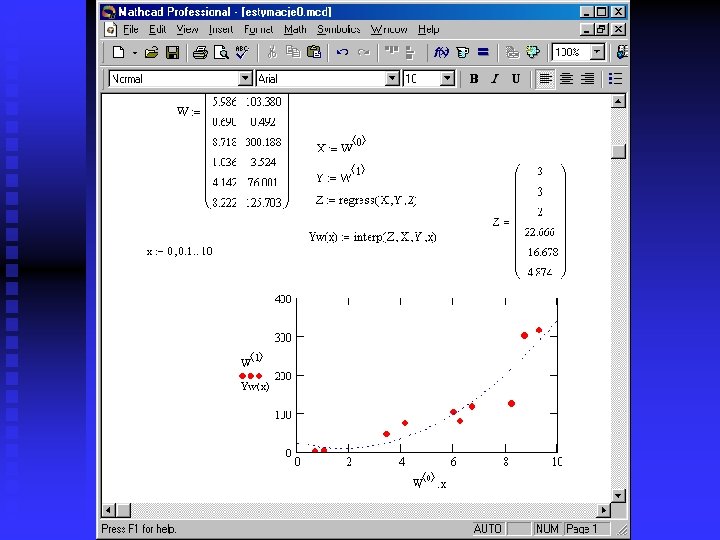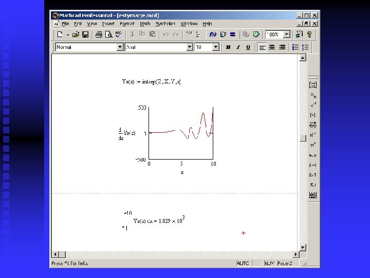 Interpreting function n n Operates on vectors obtained from regress and spline family functions Building the continuous approximating function on the base of determined parameters Syntax: F(x): =interp(Z, X, Y, x) u Z – vector given by approximating function u X – vector of independent values from data set u Y - vector of dependent values from data set u x – independent values Interpreting function is implicit but can be derivated and integrated