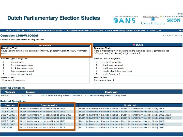 Social science traits (over-generalised!) • • Quantitative research, e. g. surveys (lots of variables > codebook needed) and qualitative research, e. g. interviews and observations May involve individual people > ethical issues, informed consent forms, sensitive or anonymised data Often longitudinal research (e. g. the start of the International Social Survey Programm (ISSP) was in 1972) Mixed attitude towards sharing and reusing data, e. g. • • • Political scientists are used to sharing data Economists often explore private third-party data (cannot be released or archived afterwards) Sociotechnical researchers cannot release or reproduce all materials (lab journals remain property of the lab) (Borgman, p. 149) For psychologists research methodology may have more value than the data Recent NL tendency (Oldenburg): publication packages along with publication: data + statistical syntax queries Beau Oldenburg: Integriteit en duurzaamheid in het digitale tijdperk. White paper DANS, 2015. http: //www. dans. knaw. nl/ (in Dutch)