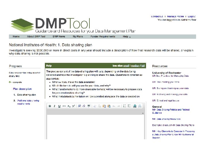 NIH Data Management Plans • NIH requires a Data Management Plan for grants $500, 000 and over. – Key Points of NIH Data Management Plan • • • What data will be shared? Who will have access to the data? Where will the data to be shared be located? When will the data be shared? How will researchers locate and access the data?