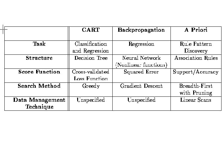 Algorithm Components 1. The task the algorithm is used to address (e. g. classification, clustering, etc. ) 2. The structure of the model or pattern we are fitting to the data (e. g. a linear regression model) 3. The score function used to judge the quality of the fitted models or patterns (e. g. accuracy, BIC, etc. ) 4. The search or optimization method used to search over parameters and/or structures (e. g. steepest descent, MCMC, etc. ) 5. The data management technique used for storing, indexing, and retrieving data (critical when data too large to reside in memory)