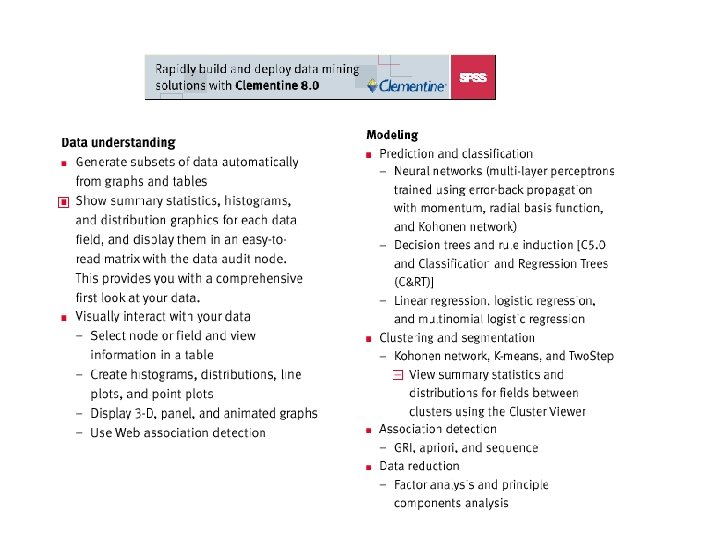Models Prediction • Linear regression • Piecewise linear • Nonparametric regression • Classification Probability Distributions • Parametric models • Mixtures of parametric models • Graphical Markov models (categorical, continuous, mixed) Structured Data • Time series • Markov models • Mixture Transition Distribution models • Hidden Markov models • Spatial models