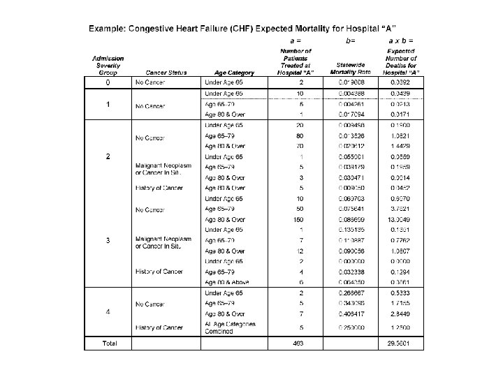 Risk Adjustment • Discharge data like these allow for comparisons of, e. g. , mortality rates for CABG procedure across hospitals. • Some hospitals accept riskier patients than others; a fair comparison must account for such differences. • PHC 4 (and many other organizations) use “indirect standardization” • http: //www. phc 4. org