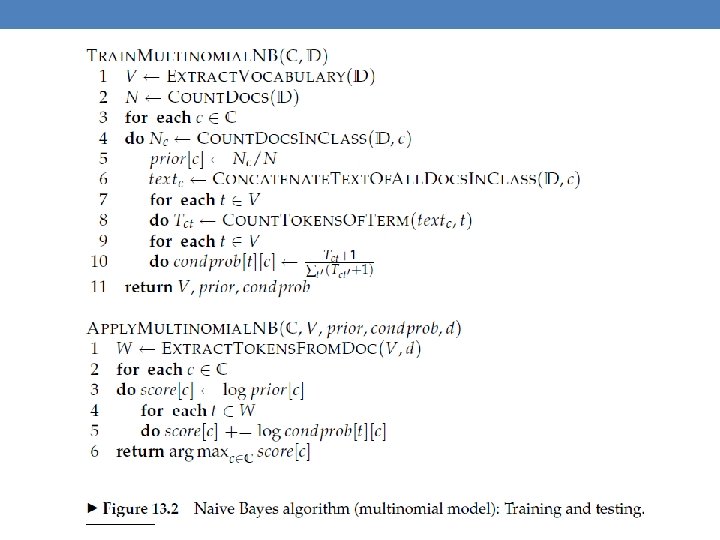 Example News titles for Politics and Sports Politics documents “Obama meets Merkel” “Obama elected again” “Merkel visits Greece again” P(p) = 0. 5 obama: 2, meets: 1, merkel: 2, Vocabulary elected: 1, again: 2, visits: 1, greece: 1 size: 14 terms Total terms: 10 New title: Sports “OSFP European basketball champion” “Miami NBA basketball champion” “Greece basketball coach? ” P(s) = 0. 5 OSFP: 1, european: 1, basketball: 3, champion: 2, miami: 1, nba: 1, greece: 1, coach: 1 Total terms: 11 X = “Obama likes basketball” P(Politics|X) ~ P(p)*P(obama|p)*P(likes|p)*P(basketball|p) = 0. 5 * 3/(10+14) *1/(10+14) * 1/(10+14) = 0. 000108 P(Sports|X) ~ P(s)*P(obama|s)*P(likes|s)*P(basketball|s) = 0. 5 * 1/(11+14) * 4/(11+14) = 0. 000128