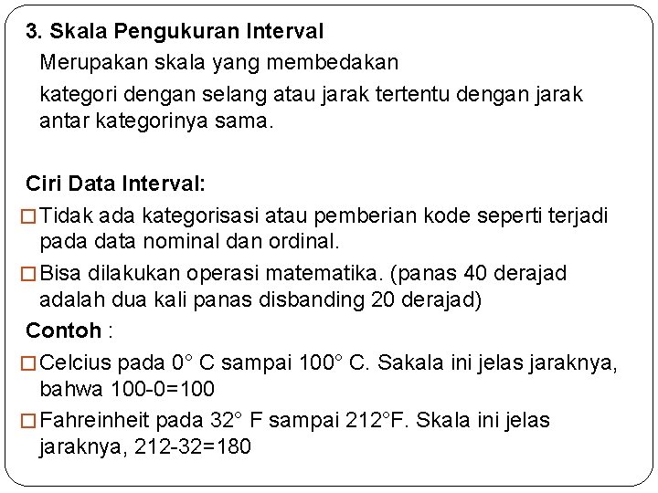 3. Skala Pengukuran Interval Merupakan skala yang membedakan kategori dengan selang atau jarak tertentu dengan jarak antar kategorinya sama. Ciri Data Interval: � Tidak ada kategorisasi atau pemberian kode seperti terjadi pada data nominal dan ordinal. � Bisa dilakukan operasi matematika. (panas 40 derajad adalah dua kali panas disbanding 20 derajad) Contoh : � Celcius pada 0° C sampai 100° C. Sakala ini jelas jaraknya, bahwa 100 -0=100 � Fahreinheit pada 32° F sampai 212°F. Skala ini jelas jaraknya, 212 -32=180