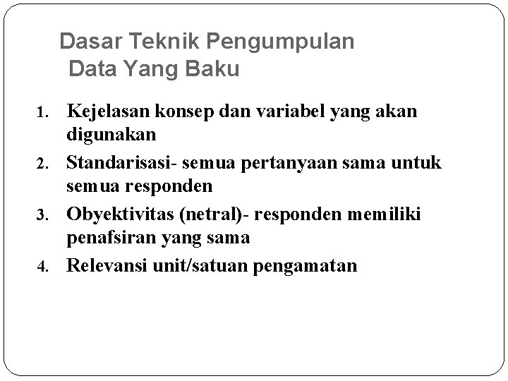 Dasar Teknik Pengumpulan Data Yang Baku 1. Kejelasan konsep dan variabel yang akan digunakan 2. Standarisasi- semua pertanyaan sama untuk semua responden 3. Obyektivitas (netral)- responden memiliki penafsiran yang sama 4. Relevansi unit/satuan pengamatan