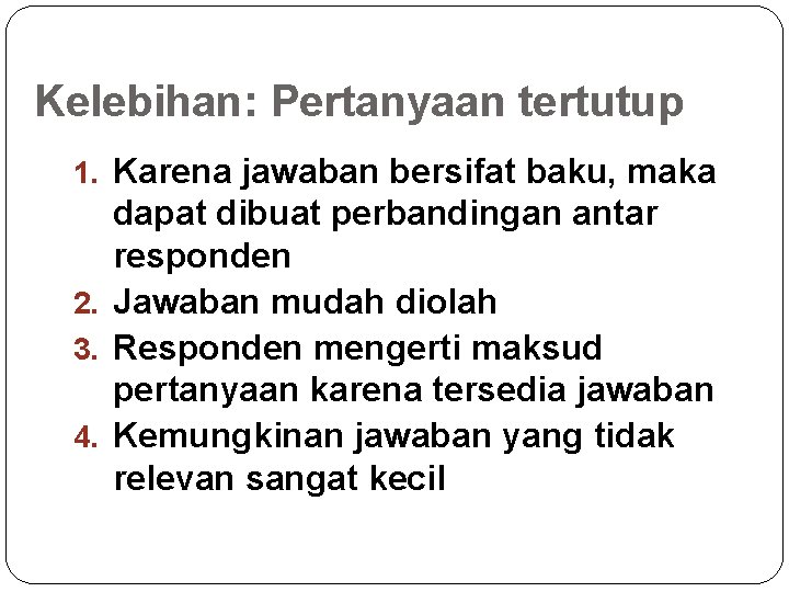 Kelebihan: Pertanyaan tertutup 1. Karena jawaban bersifat baku, maka dapat dibuat perbandingan antar responden 2. Jawaban mudah diolah 3. Responden mengerti maksud pertanyaan karena tersedia jawaban 4. Kemungkinan jawaban yang tidak relevan sangat kecil