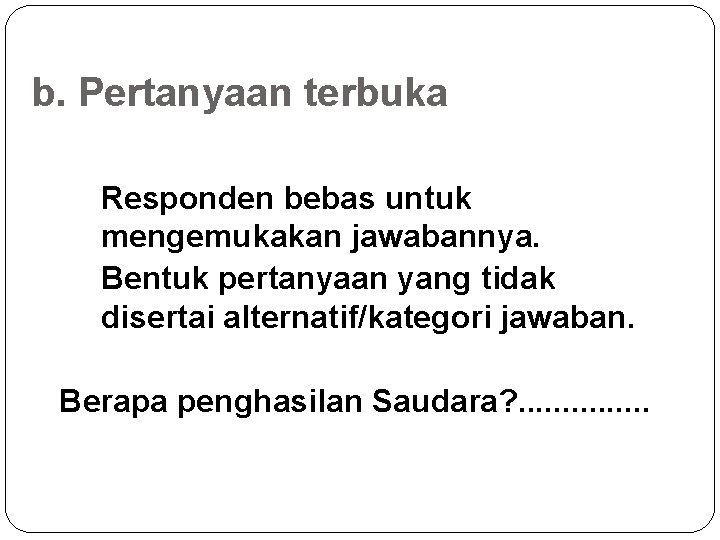b. Pertanyaan terbuka 1. Responden bebas untuk mengemukakan jawabannya. 2. Bentuk pertanyaan yang tidak disertai alternatif/kategori jawaban. Berapa penghasilan Saudara? . . . .