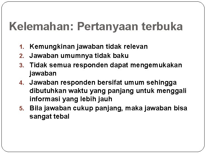 Kelemahan: Pertanyaan terbuka 1. Kemungkinan jawaban tidak relevan 2. Jawaban umumnya tidak baku 3. Tidak semua responden dapat mengemukakan jawaban 4. Jawaban responden bersifat umum sehingga dibutuhkan waktu yang panjang untuk menggali informasi yang lebih jauh 5. Bila jawaban cukup panjang, maka jawaban bisa sangat tebal