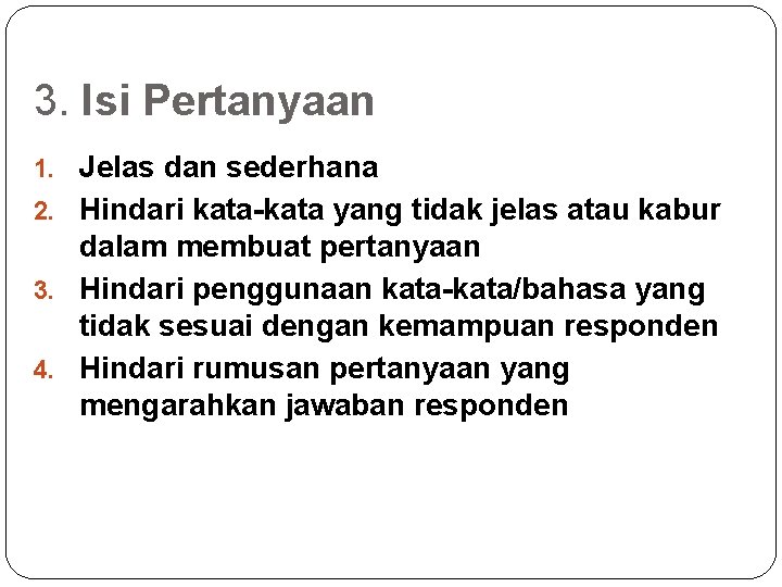 3. Isi Pertanyaan 1. Jelas dan sederhana 2. Hindari kata-kata yang tidak jelas atau kabur dalam membuat pertanyaan 3. Hindari penggunaan kata-kata/bahasa yang tidak sesuai dengan kemampuan responden 4. Hindari rumusan pertanyaan yang mengarahkan jawaban responden