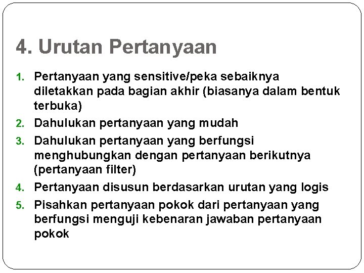 4. Urutan Pertanyaan 1. Pertanyaan yang sensitive/peka sebaiknya 2. 3. 4. 5. diletakkan pada bagian akhir (biasanya dalam bentuk terbuka) Dahulukan pertanyaan yang mudah Dahulukan pertanyaan yang berfungsi menghubungkan dengan pertanyaan berikutnya (pertanyaan filter) Pertanyaan disusun berdasarkan urutan yang logis Pisahkan pertanyaan pokok dari pertanyaan yang berfungsi menguji kebenaran jawaban pertanyaan pokok