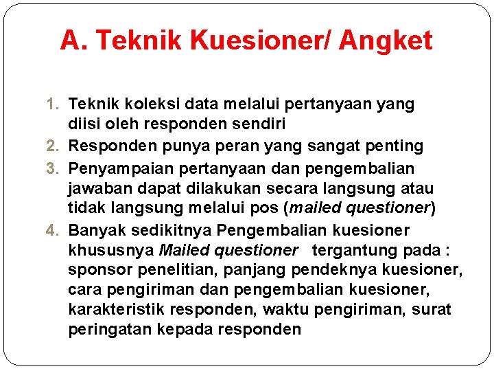 A. Teknik Kuesioner/ Angket 1. Teknik koleksi data melalui pertanyaan yang diisi oleh responden sendiri 2. Responden punya peran yang sangat penting 3. Penyampaian pertanyaan dan pengembalian jawaban dapat dilakukan secara langsung atau tidak langsung melalui pos (mailed questioner) 4. Banyak sedikitnya Pengembalian kuesioner khususnya Mailed questioner tergantung pada : sponsor penelitian, panjang pendeknya kuesioner, cara pengiriman dan pengembalian kuesioner, karakteristik responden, waktu pengiriman, surat peringatan kepada responden