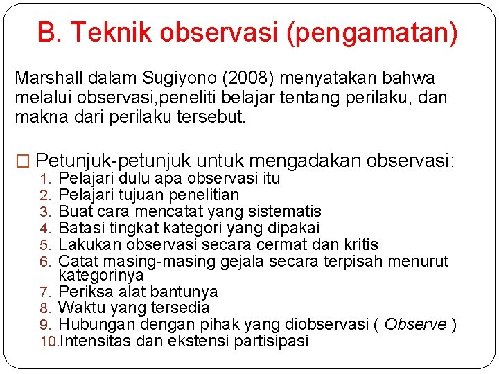 B. Teknik observasi (pengamatan) Marshall dalam Sugiyono (2008) menyatakan bahwa melalui observasi, peneliti belajar tentang perilaku, dan makna dari perilaku tersebut. � Petunjuk-petunjuk untuk mengadakan observasi: 1. Pelajari dulu apa observasi itu 2. Pelajari tujuan penelitian 3. Buat cara mencatat yang sistematis 4. Batasi tingkat kategori yang dipakai 5. Lakukan observasi secara cermat dan kritis 6. Catat masing-masing gejala secara terpisah menurut kategorinya 7. Periksa alat bantunya 8. Waktu yang tersedia 9. Hubungan dengan pihak yang diobservasi ( Observe ) 10. Intensitas dan ekstensi partisipasi