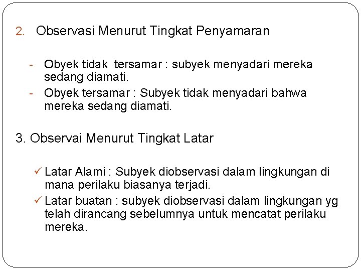 2. Observasi Menurut Tingkat Penyamaran Obyek tidak tersamar : subyek menyadari mereka sedang diamati. - Obyek tersamar : Subyek tidak menyadari bahwa mereka sedang diamati. - 3. Observai Menurut Tingkat Latar ü Latar Alami : Subyek diobservasi dalam lingkungan di mana perilaku biasanya terjadi. ü Latar buatan : subyek diobservasi dalam lingkungan yg telah dirancang sebelumnya untuk mencatat perilaku mereka.