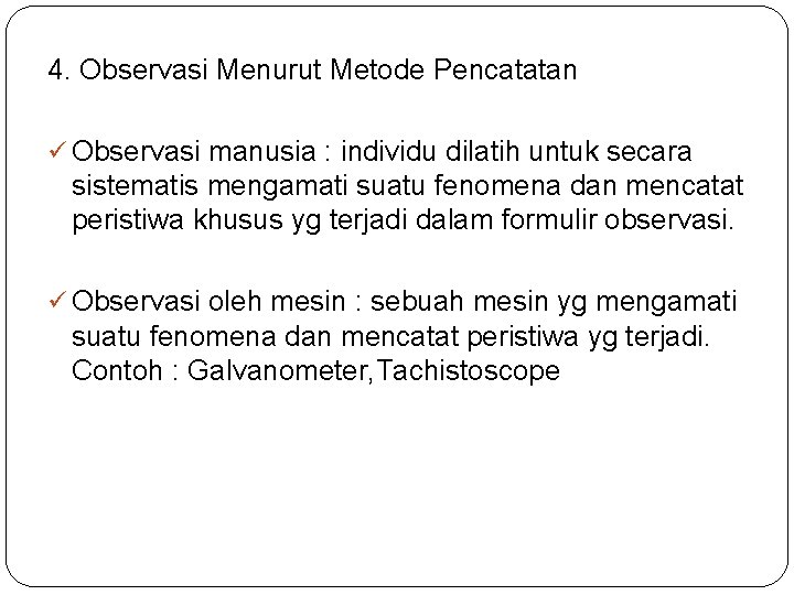 4. Observasi Menurut Metode Pencatatan ü Observasi manusia : individu dilatih untuk secara sistematis mengamati suatu fenomena dan mencatat peristiwa khusus yg terjadi dalam formulir observasi. ü Observasi oleh mesin : sebuah mesin yg mengamati suatu fenomena dan mencatat peristiwa yg terjadi. Contoh : Galvanometer, Tachistoscope