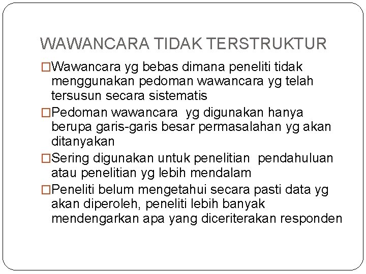 WAWANCARA TIDAK TERSTRUKTUR �Wawancara yg bebas dimana peneliti tidak menggunakan pedoman wawancara yg telah tersusun secara sistematis �Pedoman wawancara yg digunakan hanya berupa garis-garis besar permasalahan yg akan ditanyakan �Sering digunakan untuk penelitian pendahuluan atau penelitian yg lebih mendalam �Peneliti belum mengetahui secara pasti data yg akan diperoleh, peneliti lebih banyak mendengarkan apa yang diceriterakan responden