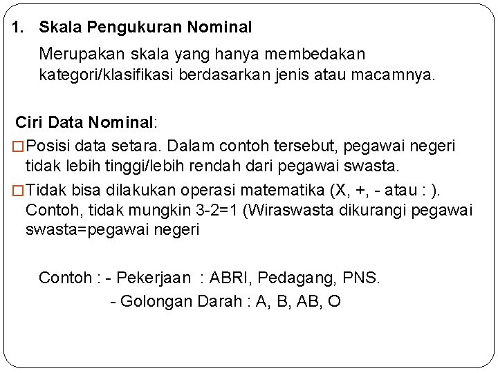 1. Skala Pengukuran Nominal Merupakan skala yang hanya membedakan kategori/klasifikasi berdasarkan jenis atau macamnya. Ciri Data Nominal: � Posisi data setara. Dalam contoh tersebut, pegawai negeri tidak lebih tinggi/lebih rendah dari pegawai swasta. � Tidak bisa dilakukan operasi matematika (X, +, - atau : ). Contoh, tidak mungkin 3 -2=1 (Wiraswasta dikurangi pegawai swasta=pegawai negeri Contoh : - Pekerjaan : ABRI, Pedagang, PNS. - Golongan Darah : A, B, AB, O