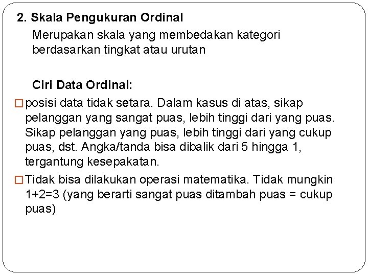 2. Skala Pengukuran Ordinal Merupakan skala yang membedakan kategori berdasarkan tingkat atau urutan Ciri Data Ordinal: � posisi data tidak setara. Dalam kasus di atas, sikap pelanggan yang sangat puas, lebih tinggi dari yang puas. Sikap pelanggan yang puas, lebih tinggi dari yang cukup puas, dst. Angka/tanda bisa dibalik dari 5 hingga 1, tergantung kesepakatan. � Tidak bisa dilakukan operasi matematika. Tidak mungkin 1+2=3 (yang berarti sangat puas ditambah puas = cukup puas)