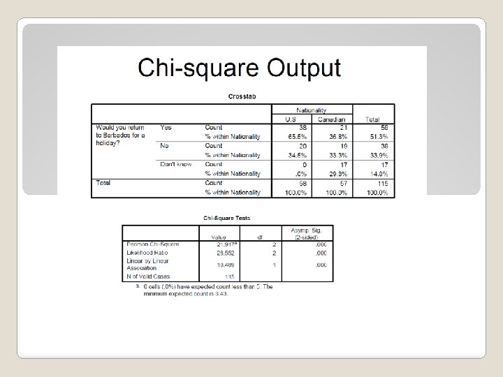 Sample Write-up 2 Results can be written up as: • “A Pearson chi-square test was conducted to examine whethere was a relationship between nationality and word-of-mouth intentions. The results revealed that there was a significant relationship between the two variables (Chi square value = 9. 51, df =1, p =. 002) U. S tourists (62%) were significantly more likely to recommend the destination to their friends/family moreso than Canadian tourists (33%) (see Tables 1 and 2).