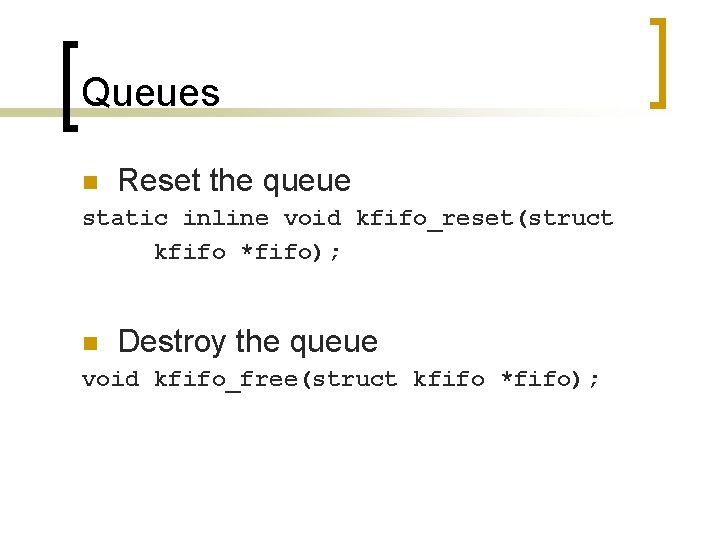 Queues n Reset the queue static inline void kfifo_reset(struct kfifo *fifo); n Destroy the queue void kfifo_free(struct kfifo *fifo);