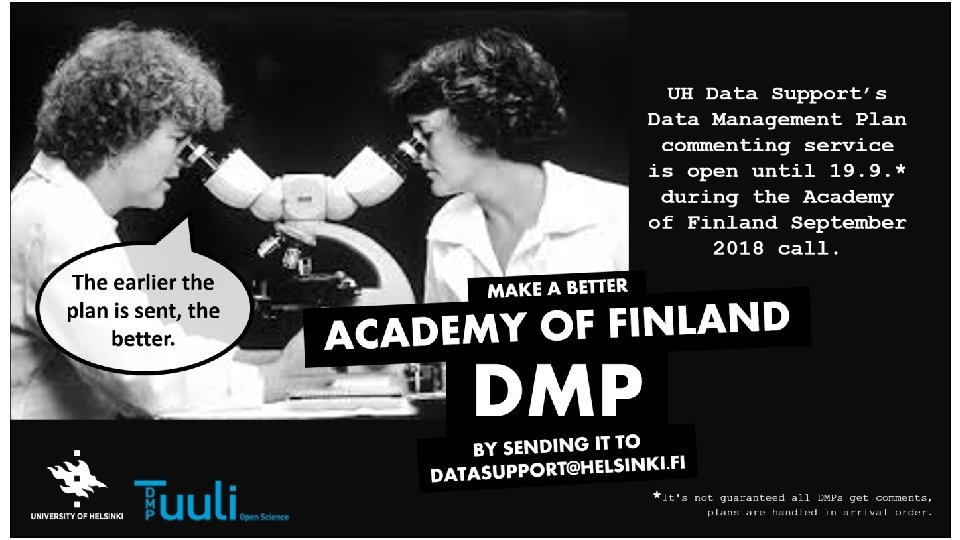 http: //dmptuuli. fi Guides maintained • UH DMP • Glossary • National DMP • Sentive data DMP • Glossary • Historian data DMP • Art&Desing data DMPTuuli helps you to plan data management