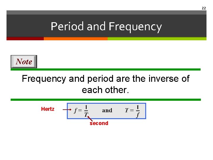 22 Period and Frequency Note Frequency and period are the inverse of each other. Hertz second