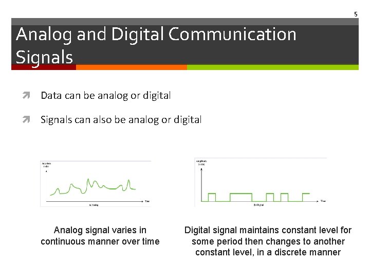 5 Analog and Digital Communication Signals Data can be analog or digital Signals can also be analog or digital Analog signal varies in continuous manner over time Digital signal maintains constant level for some period then changes to another constant level, in a discrete manner