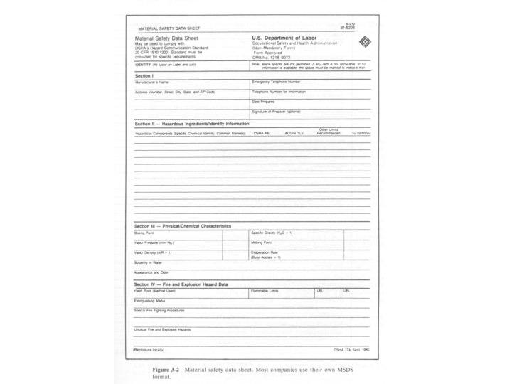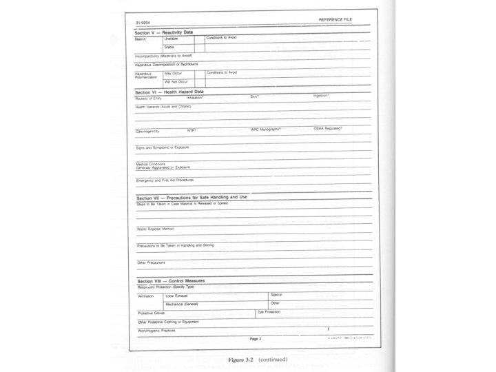 Data Useful for Health Identification (MSDS) • Threshold Limit Values (TLV) • Odor threshold for vapor • Physical state • Vapor pressure of liquid • Sensitivity to chemical or impact • Rates and heats of reaction • Hazardous by-products • Reactivity with other chemicals • LEL and UEL • Noise level of equipment • Types and degree of radiation