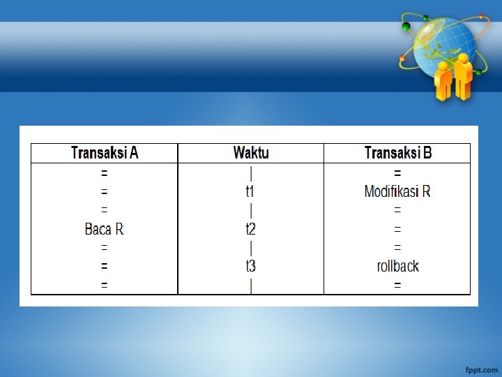 Penjelasan tabel • • Transaksi B memodifikasi record R pada t 1 Transaksi A membaca R pada t 2. Pada saat t 3 transaksi B dibatalkan. Maka transaksi A akan membaca record yang salah.