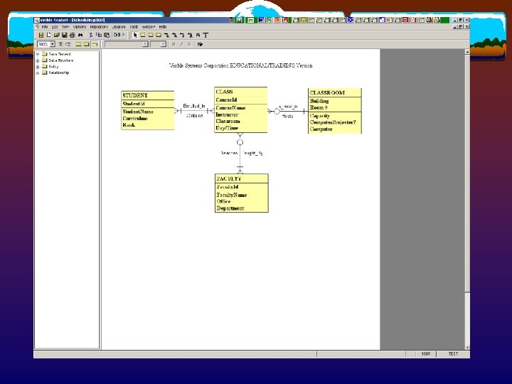 RELATIONSHIP CARDINALITIES v v v Relationships have maximum cardinality and minimum cardinality associated with them which are the maximum and minimum number of entity instances involved in the relationship respectively. The maximum cardinality numbers are those contained within the relationship diagram. The minimum cardinality numbers are either 0 or 1 and are shown as ovals or hash marks on the relationship lines respectively. RESIDES_IN DORMITORY 1: N STUDENT HOUSES v “A DORMITORY HOUSES at least 1 STUDENT and can HOUSE many STUDENTs; simultaneously, a STUDENT may or may not reside in a DORMITORY, but can RESIDE in, at most, one DORMITORY. ”