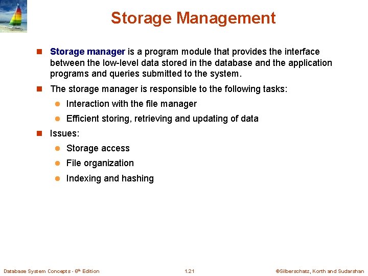 Storage Management n Storage manager is a program module that provides the interface between the low-level data stored in the database and the application programs and queries submitted to the system. n The storage manager is responsible to the following tasks: l Interaction with the file manager l Efficient storing, retrieving and updating of data n Issues: l Storage access l File organization l Indexing and hashing Database System Concepts - 6 th Edition 1. 21 ©Silberschatz, Korth and Sudarshan