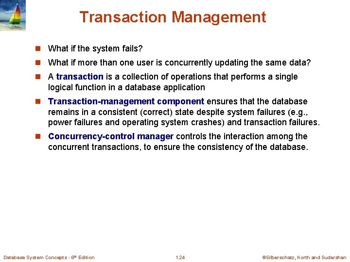 Transaction Management n What if the system fails? n What if more than one user is concurrently updating the same data? n A transaction is a collection of operations that performs a single logical function in a database application n Transaction-management component ensures that the database remains in a consistent (correct) state despite system failures (e. g. , power failures and operating system crashes) and transaction failures. n Concurrency-control manager controls the interaction among the concurrent transactions, to ensure the consistency of the database. Database System Concepts - 6 th Edition 1. 24 ©Silberschatz, Korth and Sudarshan