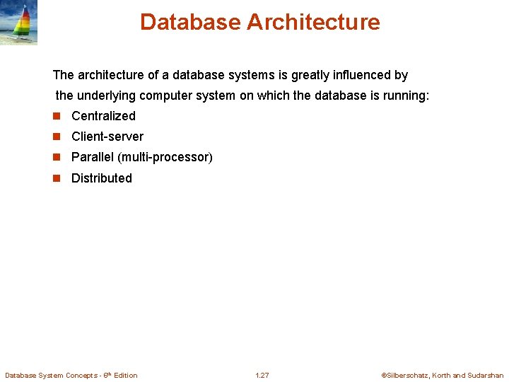 Database Architecture The architecture of a database systems is greatly influenced by the underlying computer system on which the database is running: n Centralized n Client-server n Parallel (multi-processor) n Distributed Database System Concepts - 6 th Edition 1. 27 ©Silberschatz, Korth and Sudarshan