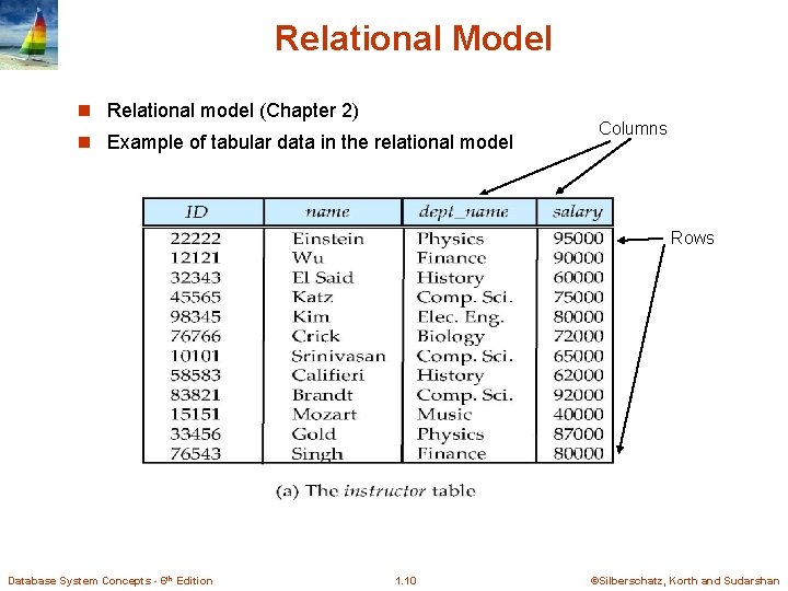 Relational Model n Relational model (Chapter 2) n Example of tabular data in the relational model Columns Rows Database System Concepts - 6 th Edition 1. 10 ©Silberschatz, Korth and Sudarshan