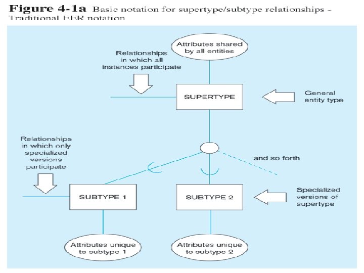 Supertypes and Subtypes • Supertype: A generic entity type that has a relationship with one or more subtypes • Subtype: A subgrouping of the entities in an entity type which has attributes that are distinct from those in other subgroupings • Attribute Inheritance: – Subtype entities inherit values of all attributes of the supertype – An instance of a subtype is also an instance of the supertype Sounds like object-oriented?