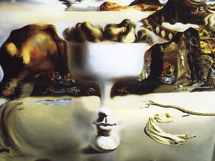 • In what he called "hand painted dream photographs, " hard objects become inexplicably limp, time bends, and metal at tracts ants like rotting flesh. • The monstrous creature draped across the painting's center resembles the artist's own face in profile
