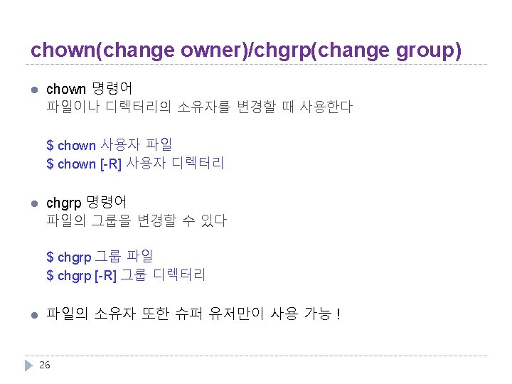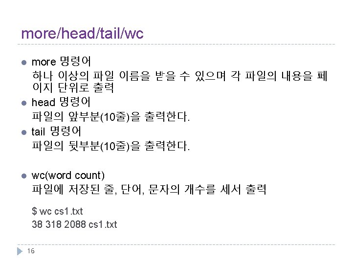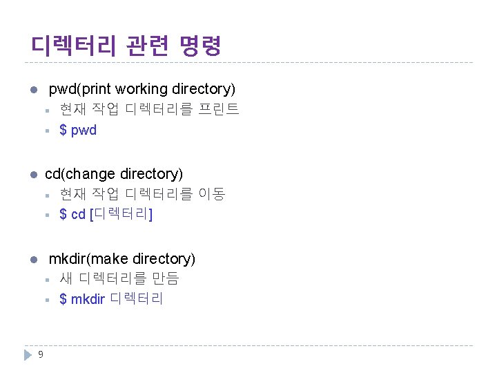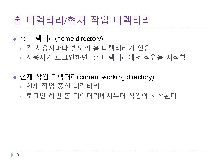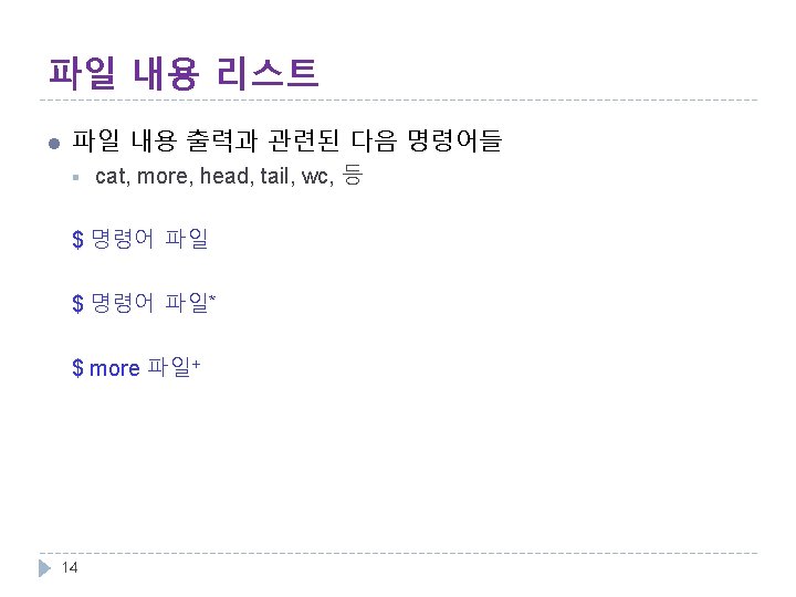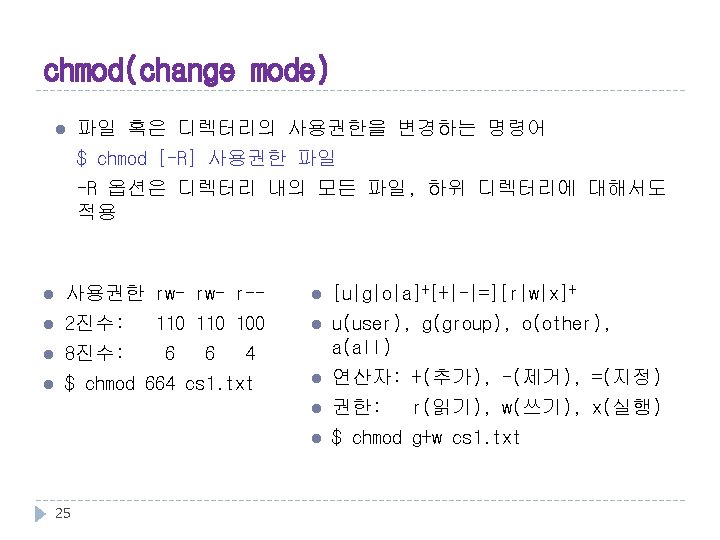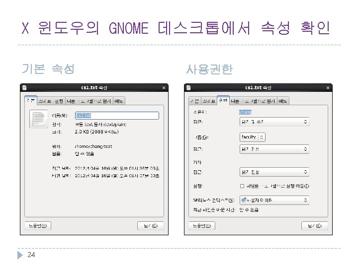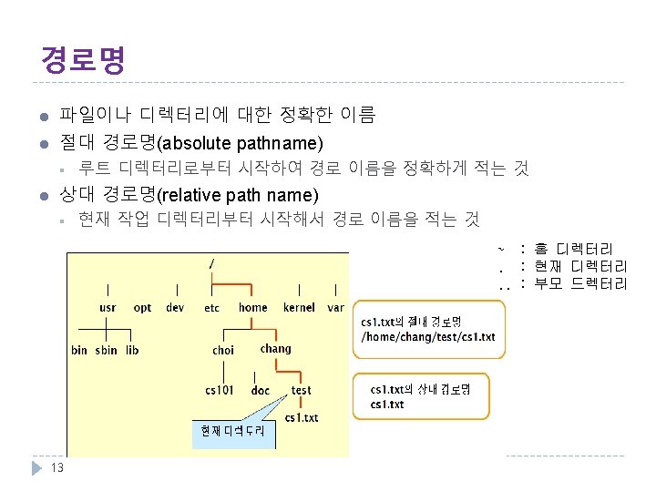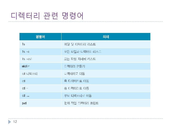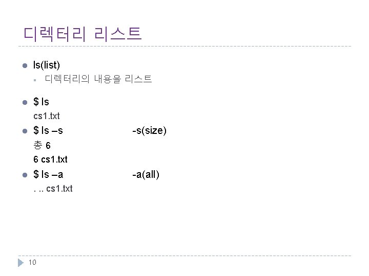 디렉터리 리스트 l $ ls –l -l(long) -rw-r--r-- 1 chang faculty 2088 4월 16일 13: 37 cs 1. txt l $ ls –asl 총 10 2 drwxr-xr-x 2 chang faculty 512 4월 16일 13: 37. 2 drwxr-xr-x 3 chang faculty 512 4월 16일 13: 37. . 6 -rw-r--r-- 1 chang faculty 2088 4월 16일 13: 37 cs 1. txt 11