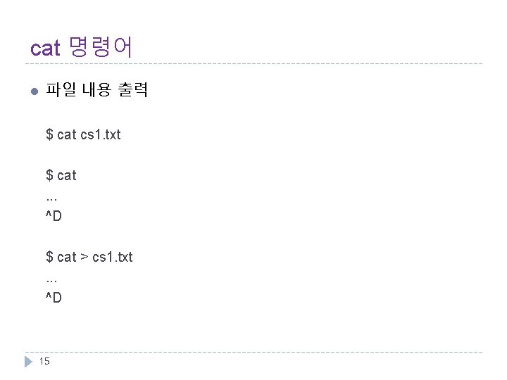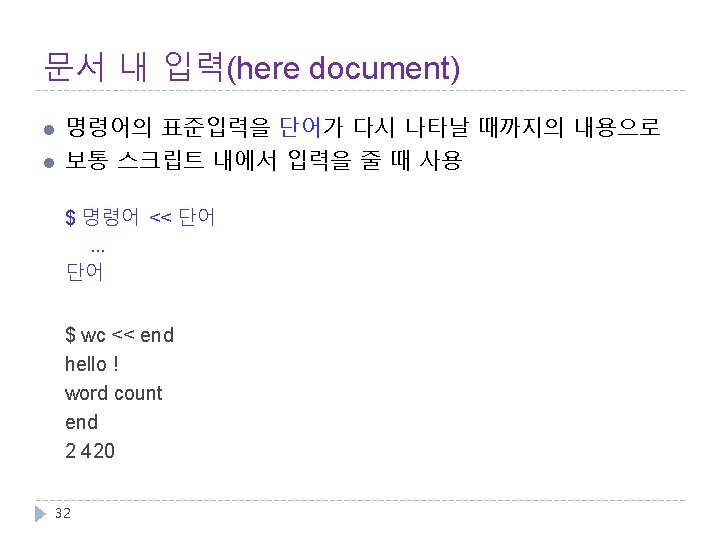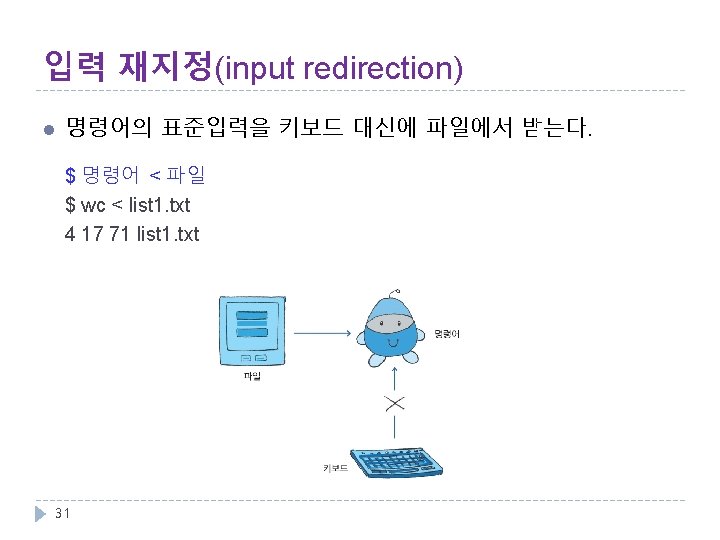 출력 추가 l 명령어의 표준출력을 모니터 대신에 기존 파일에 추가 $ 명령어 >> 파일 $ cat >> list 1. txt Bye ! This is the end of the first list. ^D $ cat list 1. txt Hi ! This is the first list. Bye ! This is the end of the first list. 30