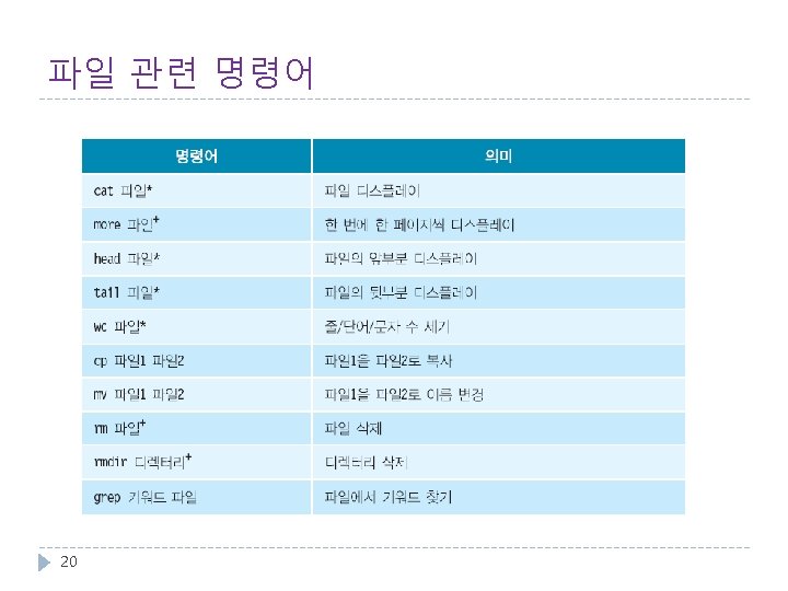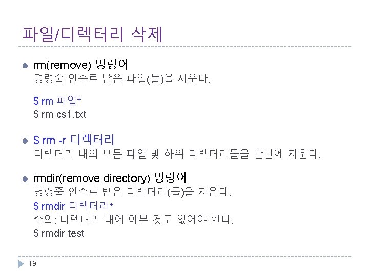 mv 명령어 l mv(move) 파일 1의 이름을 파일 2로 변경한다. $ mv 파일 1 파일 2 $ mv cs 2. txt cs 3. txt $ ls -l -rw-r--r-- 1 chang faculty 2088 4월 16일 13: 37 cs 1. txt -rw-r--r-- 1 chang faculty 2088 4월 16일 13: 56 cs 3. txt l 파일을 디렉터리 내로 이동 $ mv 파일 디렉터리 $ mv cs 3. txt /tmp 18