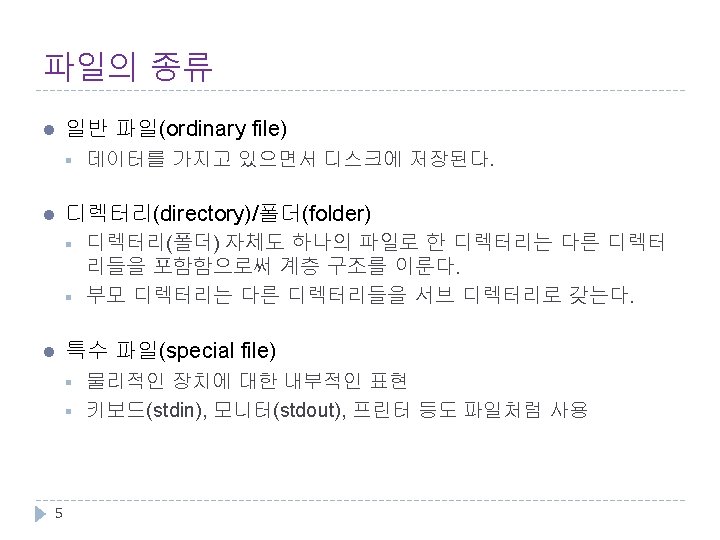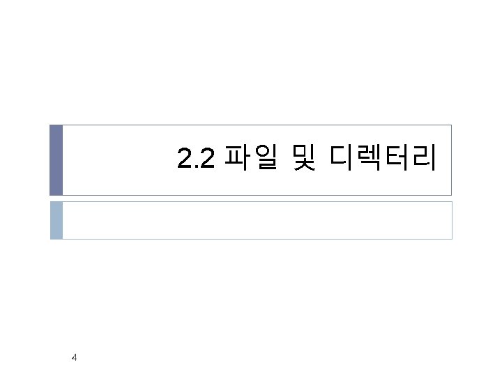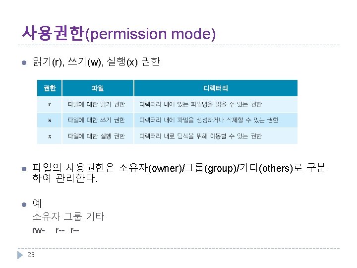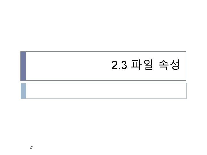 파일 속성(file attribute) l 파일의 이름, 타입, 크기, 소유자, 사용권한, 수정 시간 $ ls -sl cs 1. txt 6 -rw-r--r-- 1 chang faculty 2088 4월 16일 13: 37 cs 1. txt 22