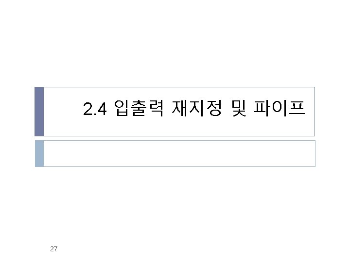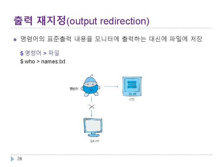 출력 재지정 예 l $ cat > list 1. txt Hi ! This is the first list. ^D l $ cat > list 2. txt Hello ! This is the second list. ^D l $ cat list 1. txt list 2. txt > list 3. txt l $ cat list 3. txt Hi ! This is the first list. Hello ! This is the second list. 29