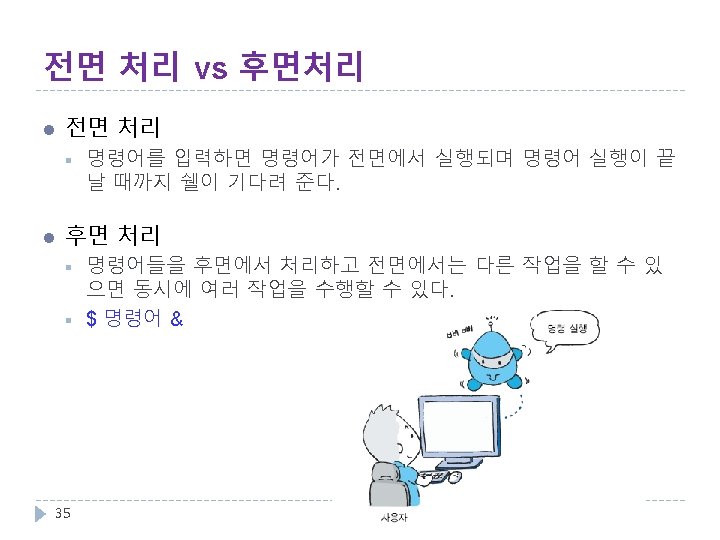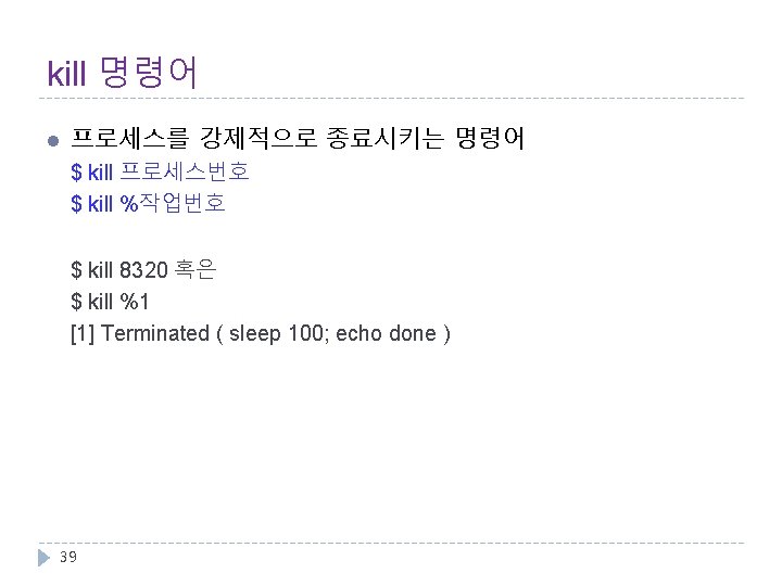 ![후면 처리 예 l l $ (sleep 100; echo done) & [1] 8320 $ 후면 처리 예 l l $ (sleep 100; echo done) & [1] 8320 $](https://slidetodoc.com/presentation_image_h2/ae0fd873cdb962c7cc13cc2234c0ff78/image-36.jpg)