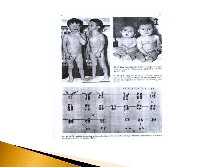 Citogenetika osoba sa Daun sindromom Kompletna trizomija 21 (47, XX, +21; 47, XY, +21) Prisutna je kod 95% slučajeva DS. Ø Nastaje hromozomskim nerazdvajanjem najčešće u oogenezi majke (90%), češće u mejozi I. Ø Rizik ponovnog javljanja u sledećoj trudnoći, kod žena koje su imale prethodni fetus ili dete sa trizomijom 21, je za 0, 75% veći od prisutnog rizika godina majke. Ø