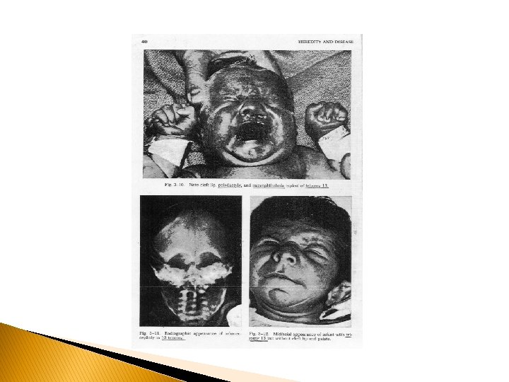 Klinička slika � � � � � ČESTI PREMATURUSI MALA PTT, PTD, MIKROCEFALIJA ILI MAKROCEFALIJA HIPERTONUS ILI HIPOTONUS TEŠKA OŠTEĆENJA MOZGA PMR POREMEĆEN, PRISUTNA JE TEŠKA MENTALNA ZAOSTALOST UKOŠENO ČELO, HIPERTELORIZAM, MIKROFTALMUS, NEKAD ANOFTALMUS RASCEP USNE I NEPCA, MIKROGNATIJA USM(88%), ANOMALIJE DIGESTIVNOG I UROGENITALNOG SISTEMA POLIDAKTILIJA, BRAZDA 4 PRSTA, DEFORMITETI STOPALA