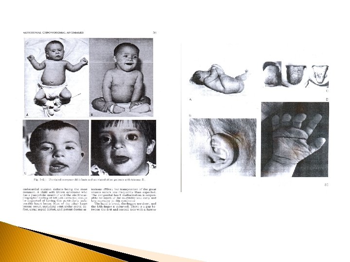 Klinička slika ČESTI PREMATURUSI (prevremeno rođena deca) � MALA PTT, PTD, MIKROCEFALIJA � HIPERTONIJA I KARAKTERISTIČAN POLOŽAJ ŠAKE: - SAVIJENI 1. 3. 4. PRST A 2. 5. SU PREKO NJIH � PROMINENTAN POTILJAK � NISKO POSTAVLJENE I LOŠE MODELIRANE UŠNE ŠKOLJKE � MALA BRADA (MIKROGNATIJA) � KRATAK GRUDNI KOŠ � MALA KARLICA OGRANIČENE ABDUKCIJE � 99% DECE SA ES IMAJU TEŠKE KOMBINOVANE USM � ANOMALIJE DIGESTIVNOG I UROGENITALNOG SISTEMA � Ø BROJNE I TEŠKE ANOMALIJE UZROK SU RANE SMRTI OVE DECE Ø OKO 10% DECE SA ES PREŽIVI PRVU GODINU ŽIVOTA