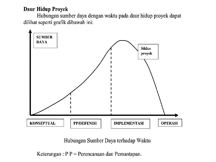 DAUR HIDUP PROYEK (PROJECT LIFE CYCLE) Dinamika kegiatan dalam siklus proyek bervariasi mulai dari titik awal kemudian meningkat jenis dan intensitasnya sampai ke puncak, turun, dan berakhir, dan semuanya ini membutuhkan sumberdaya antara lain: Orang – Jam (man – hour). Dana Material Peralatan