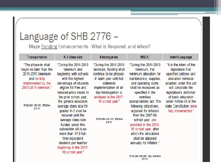 How Are New Resources Phased-in Under SHB 2776? School Year 2010 -11 2011 -12 2012 -13 2013 -14 2014 -15 2015 -16 2016 -17 2017 -18 219 Schools More funding can begin More funding must begin Continues to ramp up Fully Funded $0 More funding can begin More funding must begin Continues to ramp up Fully Funded More funding can begin More funding must begin Continues to ramp up Funded at new level More funding can begin More funding must begin Continues to ramp up Fully Funded Full-Day Kindergarten 1 Must be fully funded statewide by 2017 -18 Phase-in based on FRPL K-3 Class Size Reduction 2 3 Must be fully funded statewide by 2017 -18 Phase-in based on FRPL Maintenance, Supplies, Operation Costs (MSOC) Must be fully funded by 2015 -16 $ per student basis Basic Transportation 4 Must be fully funded by 2014 -15 % of formula funded basis