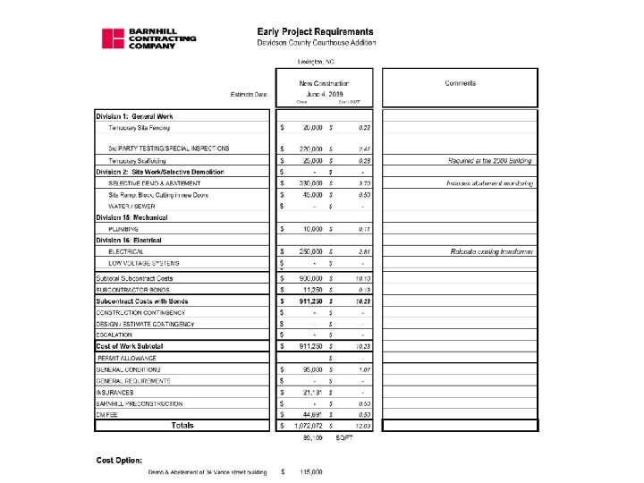 Important Dates Release Barnhill to Procure Early Project Requirements – 6/11/19 Advertise for Professional Services and Abatement and Demolition – 6/12/19 (After Board Approval) Prequalifications Complete – 6/14/19 Pre Bid Meeting Demolition and Abatement – 6/14/19 Bid Day for Abatement/Demolition and Professional Services – 6/27/19 Pre Bid Meeting Final GMP - 6/26/19 @ 1: 30 PM Final GMP - Bid Day Morning Date & Time: Group 1 – 7/23/19 @ 10: 00 AM Final GMP - Bid Day Afternoon Date & Time: Group 2 – 7/23/19 @ 2: 00 PM