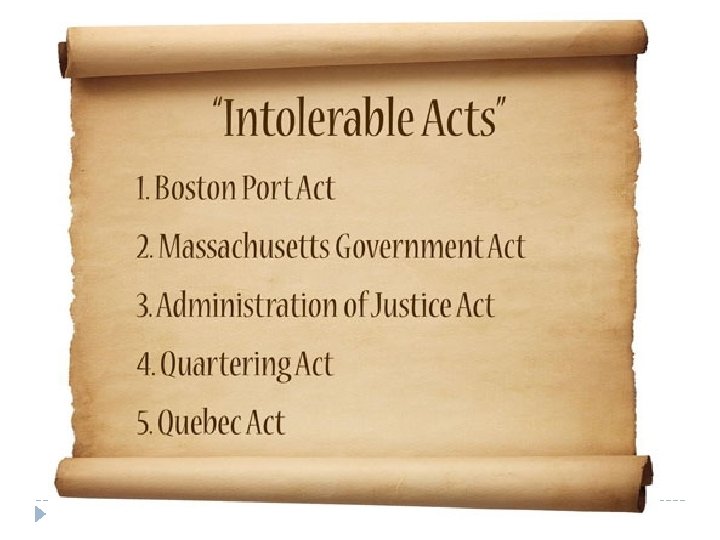 The Intolerable Acts 4 -3. 1: Explain the major political and economic factors leading to the American Revolution, including the French and Indian war, the Stamp Act, the Tea Act, and Intolerable Acts as well as American resistance to these acts through boycotts, petitions, and congresses.